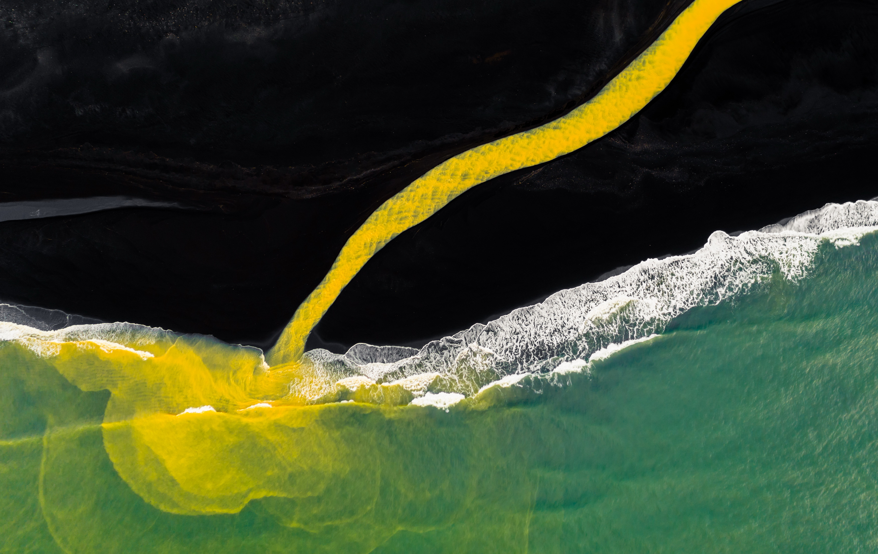 에메랄드 빛의 바다가 만들어내는 흰색의 물결, 그 위로 곡선을 그리며 흘러 들어와 파장을 그리며 번져 나가는 노란 빛깔의 조화는 마치 검은 도화지 위해 흰색, 노락색, 에메랄드 색의 아크릴 물감을 흩뿌려 놓은 듯한 예술 작품을 연상시킵니다. 자연이 만들어내는 아름다움을 우연히 맞이한 사진 작가에게는 이 광경이 그 날의 예상치 못한 행운으로 다가왔을 듯 합니다.