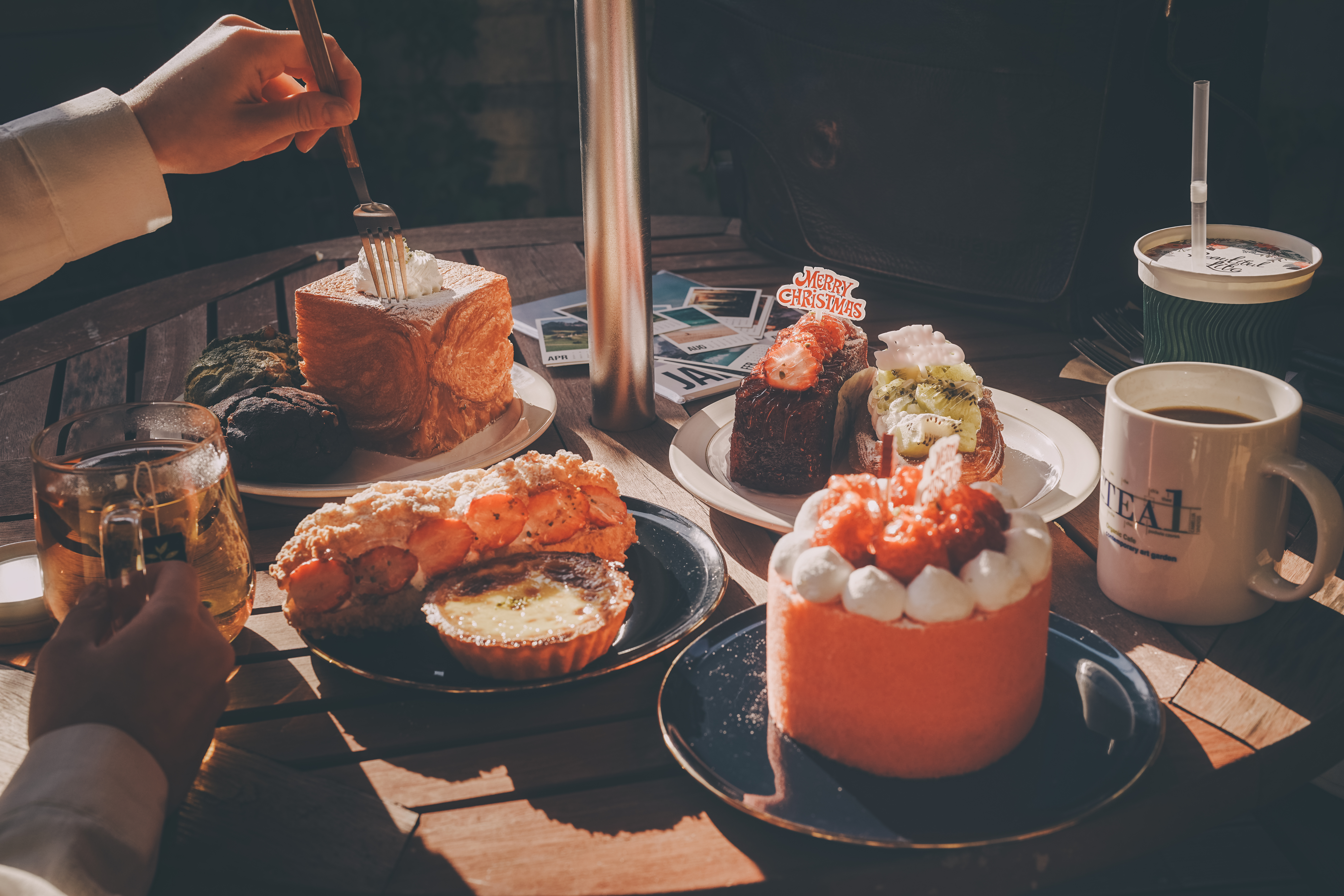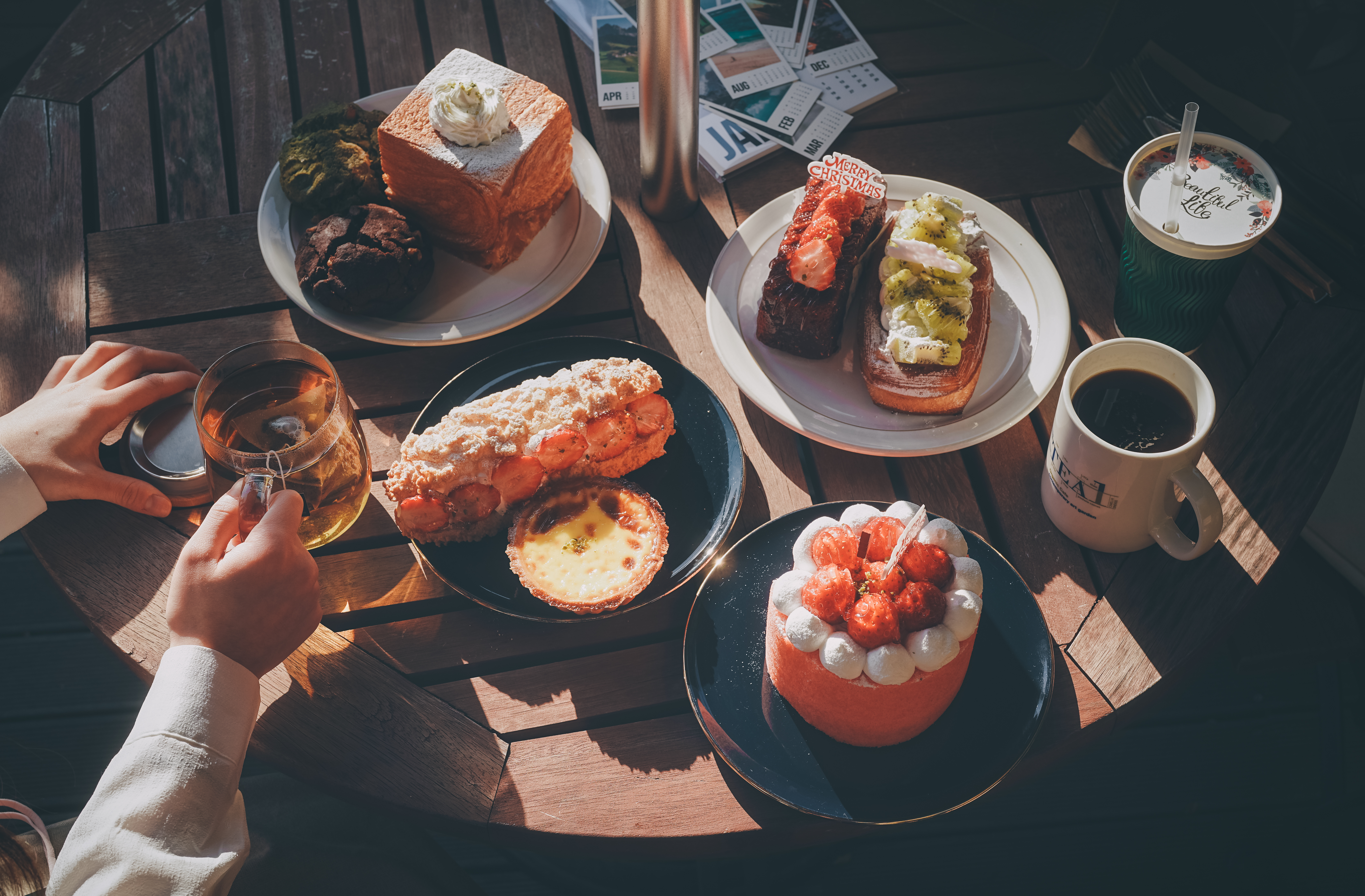 디저트의 색감을 강조하면서도 햇살 맛집 느낌의 사진을 얻고 싶다면 하이라이트와 쉐도우를 -2 정도로 줄여서 촬영해보세요. 사진의 톤이 균일하게 정리되어 멋진 카페 인증샷을 얻을 수 있습니다. 카메라 셋팅 후 테이블 전체를 위에서 찍은 항공샷은 카페 메뉴 사진으로 사용해도 손색이 없을 정도랍니다.