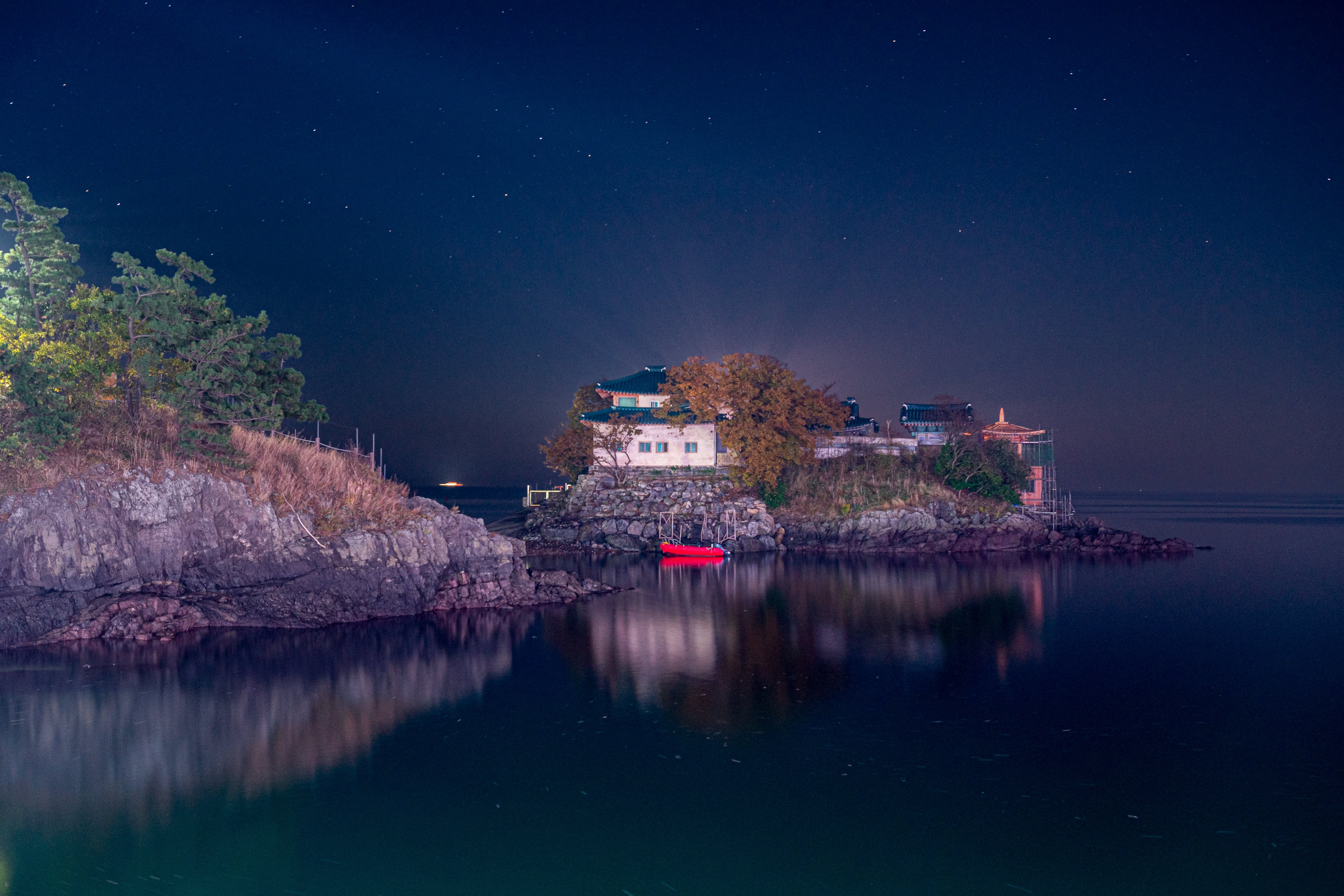 작은 바위섬 위에 위치한 간월암은 손에 꼽히는 서해안의 일몰 명소입니다. 하루 두 번의 밀물 시간에 따라 섬이 되는 곳으로, 방문 전 꼭 물때를 확인해야 하는 곳이기도 합니다. 간월암은 고려시대 무학대사가 수행 중 달을 보고 깨달음을 얻은 장소로, 물 위에 떠있는 모습이 연꽃과 같다 하여 ‘연화대’로 불리기도 하는데요. 아름다운 낙조와 서정적인 밤 풍경으로 사진작가와 여행객들의 발걸음이 끊이지 않는 곳입니다. 일출과 일몰, 달맞이 여행이 모두 가능해 새해 여행지로도 인기가 많은 곳이죠. 달빛이 바다 위에 떠있는 암자를 비추면 그 반영이 물에 비치면 더욱 신비로운 분위기를 만들어냅니다.
