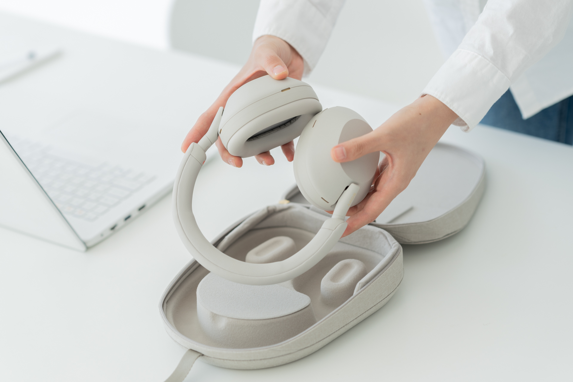 또한, WH-1000XM5는 한번의 완충으로 최대 30시간 사용할 수 있는 고성능 배터리를 탑재했는데요. 여기에 함께 제공되는 접이식 휴대용 케이스와 함께 사용하면 좁은 기내에서도 편리하게 휴대할 수 있는 여행에 최적화된 헤드폰입니다.