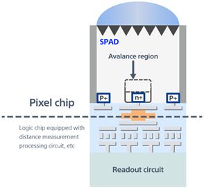 IMX 611은 이면조사형의 SPAD 화소를 이용한 화소 칩(상부)과 거리 측정 처리 회로가 장착된 로직 칩(하부)를 Cu-Cu 연결로 적층하여 각 화소마다 전도한다. 화소 칩 하단에 회로를 배치해 개구율[5]을 확보함과 동시에 SPAD로서 미세한 10μm의 화소 사이즈를 실현했다. 특히, 소니 세미컨덕터 솔루션즈 사업부는 빛의 입사면에 요철을 설치해 입사광을 회절 시키며 흡수율을 높이고, 나아가 화소 내 최적화된 Avalanche 설계 적용으로 더욱 효율적으로 증폭 현상을 구현했다.