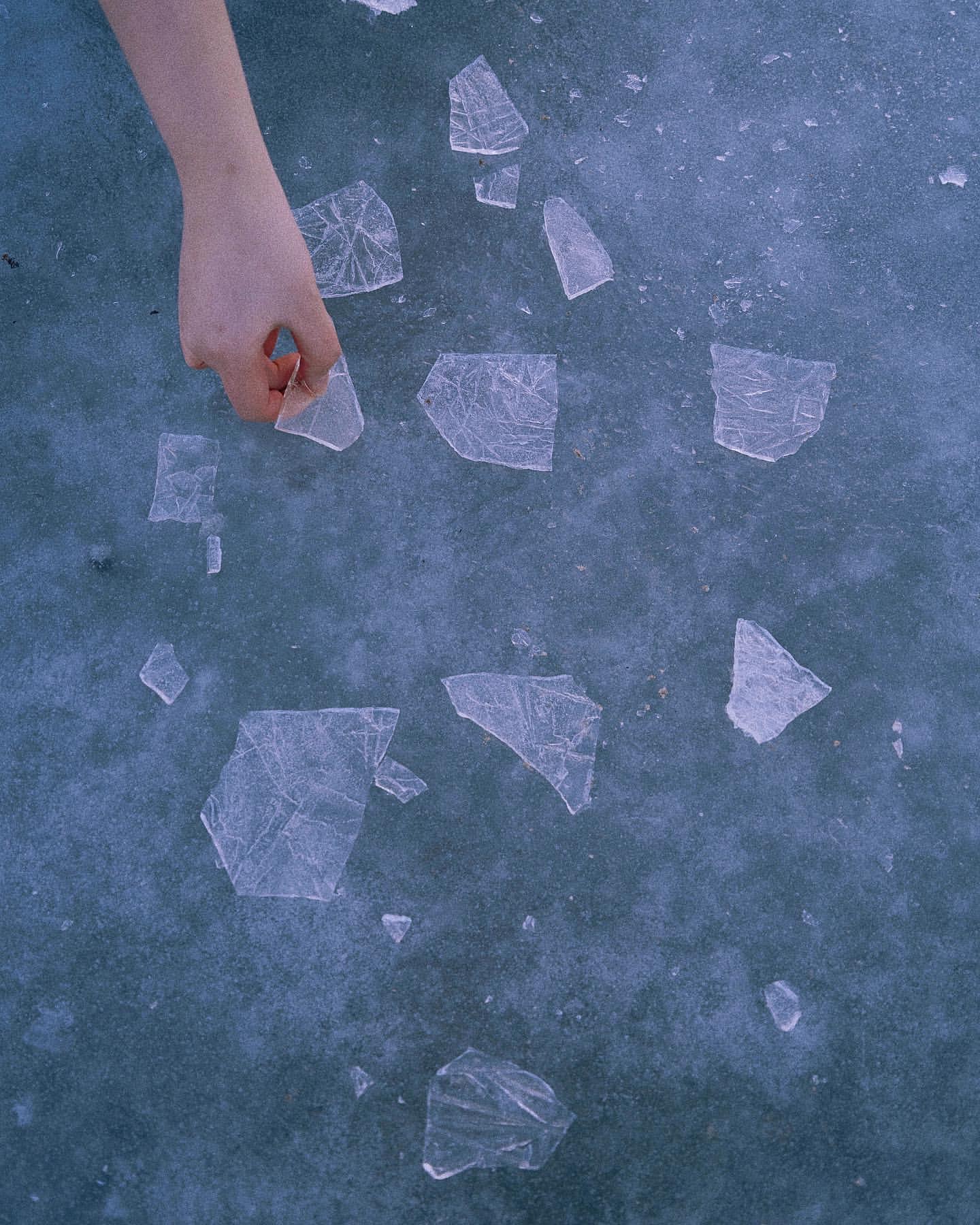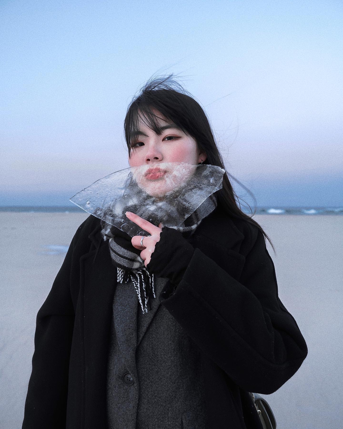 그리고 날씨가 추워지면 해변 사이에 있는 골짜기에 흐르는 물이 얼어 버려요. 이 사진은 그 얼음을 들고 촬영한 사진이에요. 얼음에 비친 모습이 색다르고 재미있잖아요. 유리와는 다르면서도 약간의 왜곡도 있고, 그래서 입술색을 더욱 짙게 해서 촬영했어요.