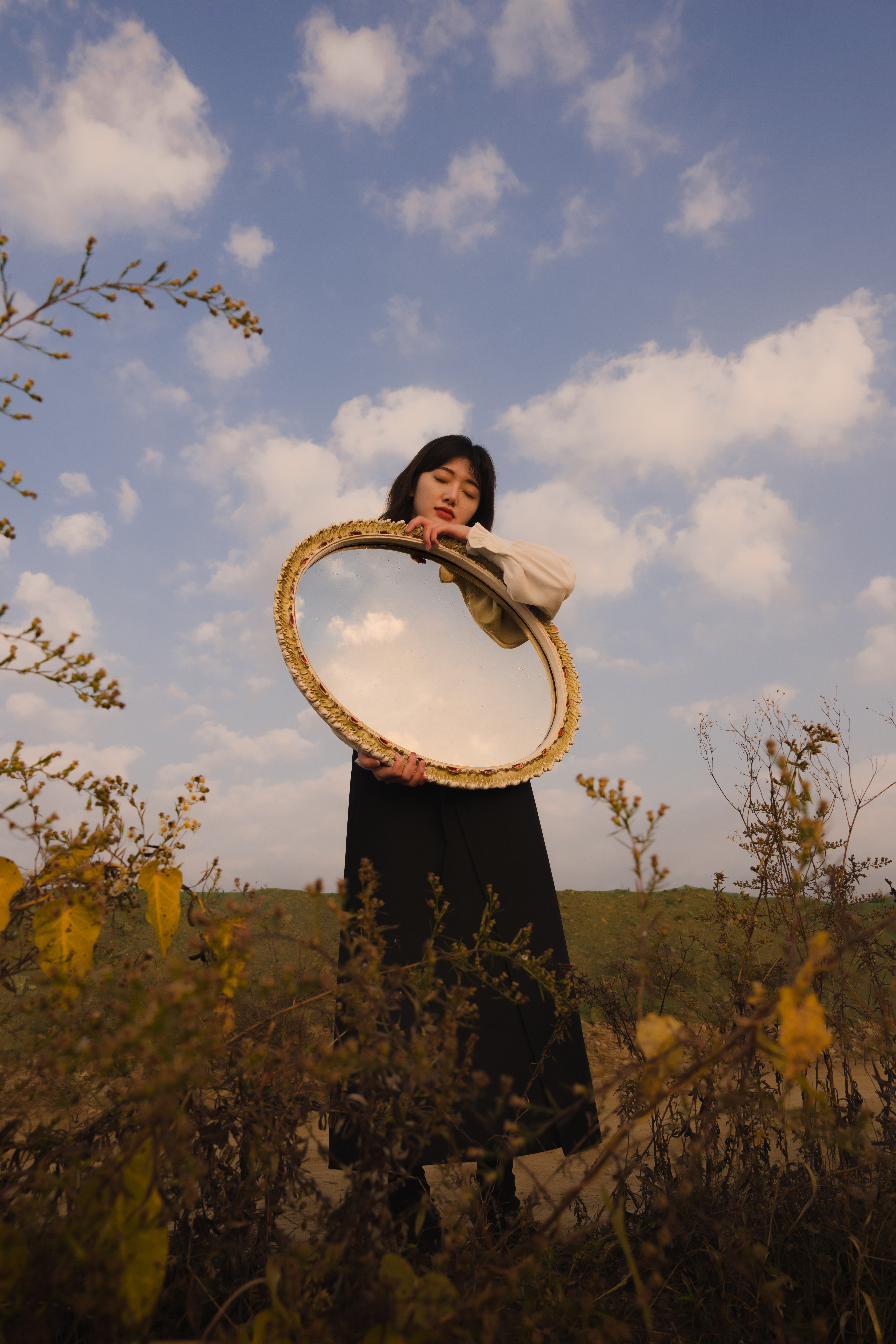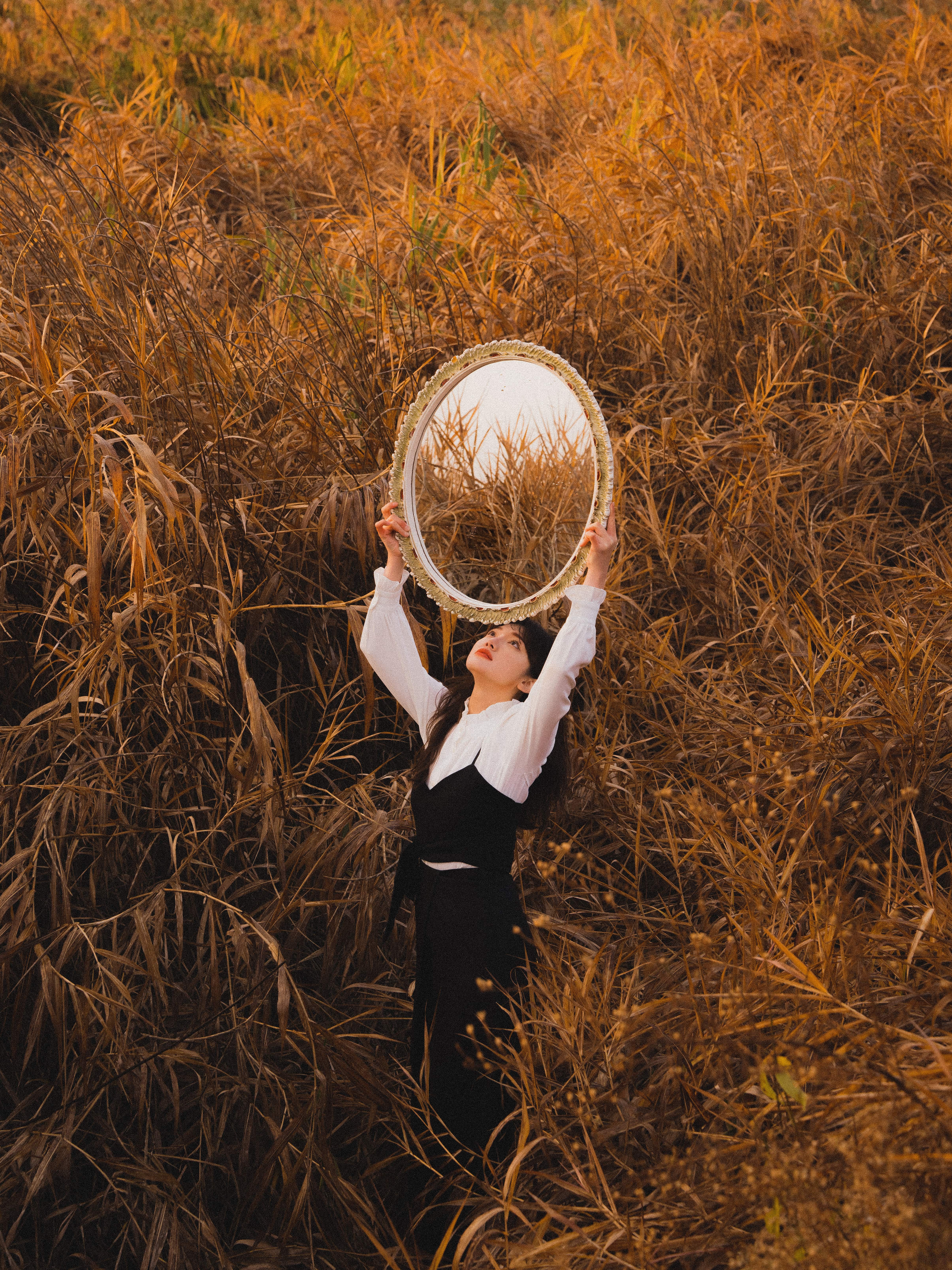 새벽녘에 아이처럼 뛰어노는 모습을 통해 자유로움을 표현하고 싶어서 소품으로는 동화책을 준비했어요. 거울은 특별한 의미를 담았다기보다는 공간을 더욱 잘 보여주기 위한 장치였어요. 이곳은 해외처럼 갈대의 키가 매우 높은데요, 이러한 매력을 설명하고 싶었어요. 거울을 통해 갈대가 더욱 높고 빽빽하게 있다는 점을 드러내서 이러한 공간의 특성을 강조했습니다. 이렇듯 예쁘고 특별한 소품을 준비하기 위해 부모님의 물건을 기웃거리기도 하고, 분리수거장을 살펴볼 때도 있어요. 가끔씩 되게 엔틱한 가구 또는 소품들을 볼 수 있거든요.