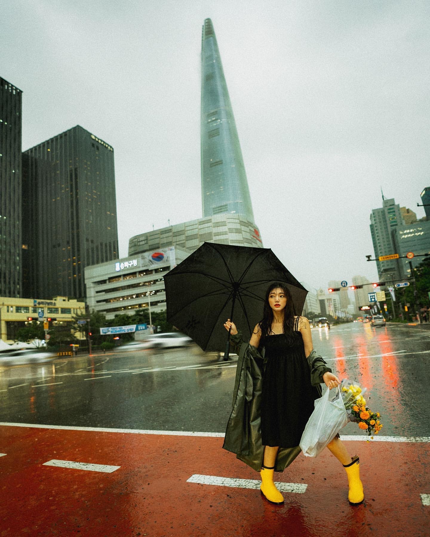 이 이미지는 잠실 철교에서 촬영한 이미지예요. 인물은 높은 위치에 있고, 아래는 도로가 있고, 도로를 비추는 가로등과 철교 높이는 비슷하죠. 그래서 가로등이 아주 완벽한 조명의 역할을 해주었어요. 조명이 워낙 세니까 빗방울이 무척 선명하게 보이더라고요. 그리고 셔터 스피드에 따라서 빗방울의 모양이 결정되는데, 셔터 스피드가 너무 느리면 궤적처럼 빗방울이 지저분하게 표현되거나 아예 담기지 않아요. 그렇다고 너무 빠르게 하면 빗방울이 점으로만 표현돼서 비의 느낌이 잘 담기지 않아요. 우리가 ‘비가 내린다’라고 생각하는 이미지는 방울이 길게 떨어지는 모양이잖아요. 그래서 셔터 스피드를 적절히 잘 조절하는 게 빗방울의 길이도 길게 나오게 하면서 비의 분위기를 잘 표현할 수 있는 방법이라고 생각해요.