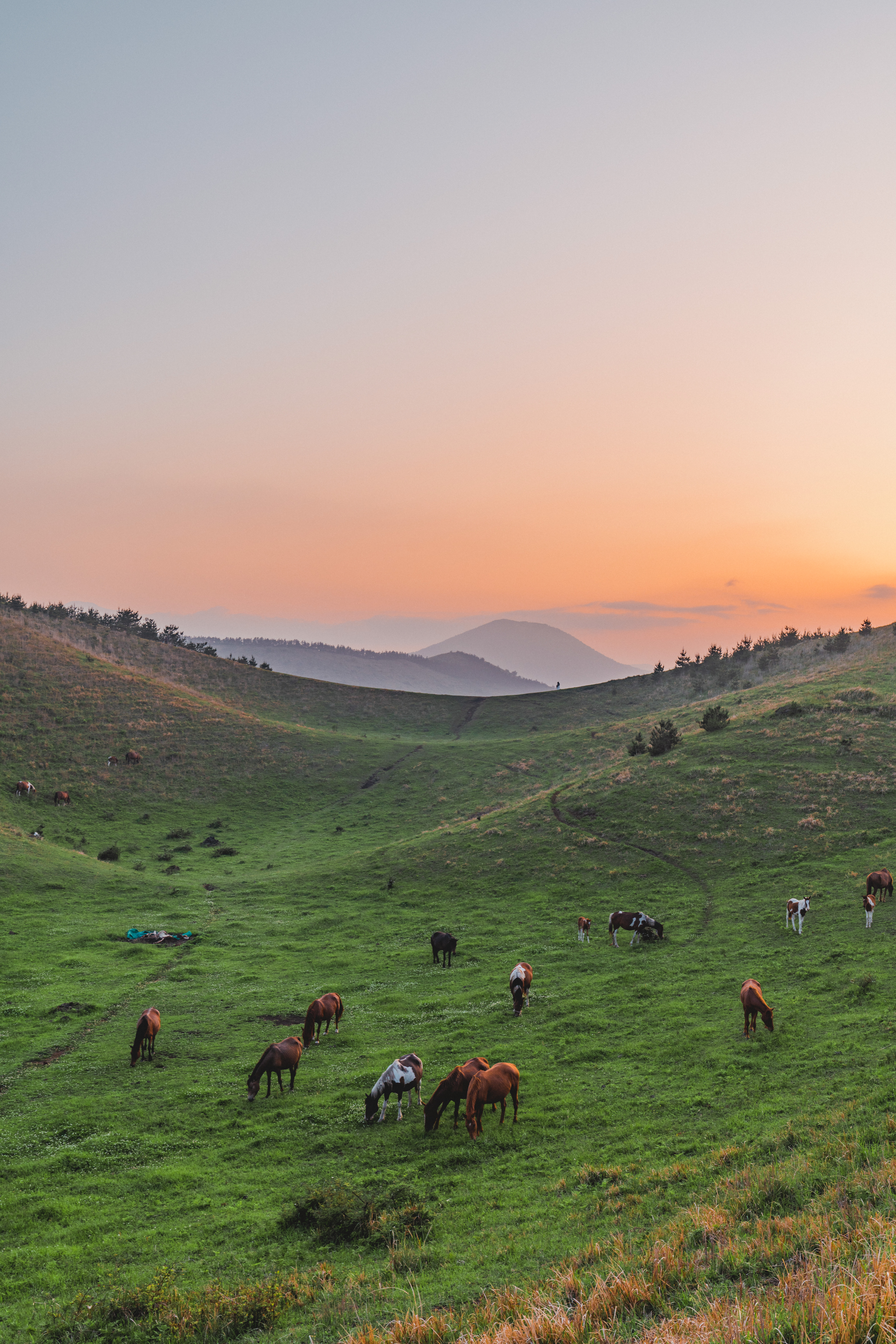 그런 점들을 담아낸 작업물이 용눈이오름 사진인데요. 노을 지는 배경으로 오름의 능선이 표현되어 있고 말이 자연스레 어우러져 정말 좋아하는 사진이에요. 용눈이오름은 현재 자연휴식제로 방문이 불가해서 풀리는 시기를 기다리고 있습니다.
