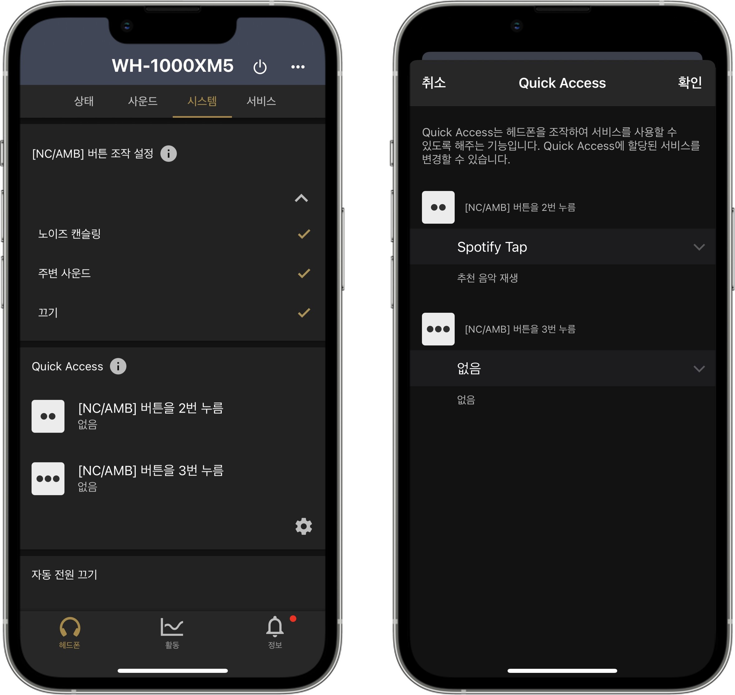 대시보드의 시스템 탭에서 Quick Access를 설정할 수 있습니다. 톱니바퀴 아이콘을 눌러 [NC/AMB] 버튼 조작을 설정합니다. 설정에 맞춰 왼쪽 헤드셋의 [NC/AMB] 버튼을 2번 혹은3번 빠르게 누르면 스포티파이 앱으로 연동됩니다.