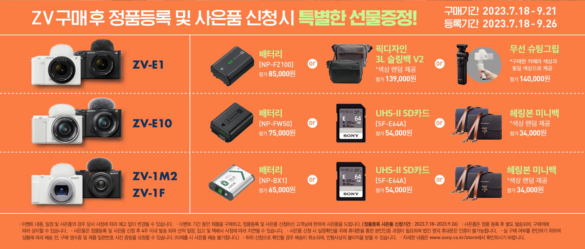 이벤트 기간 동안 브이로그 카메라 4종(ZV-E1, ZV-E10, ZV-1M2, ZV-1F)을 9월 21일(목)까지 구매하고 9월 26일(화)까지 소니코리아 고객지원 사이트(sony.co.kr/electronics/support)에서 정품등록 및 사은품 신청을 완료하면 구매 제품에 따라 다양한 혜택을 증정한다.