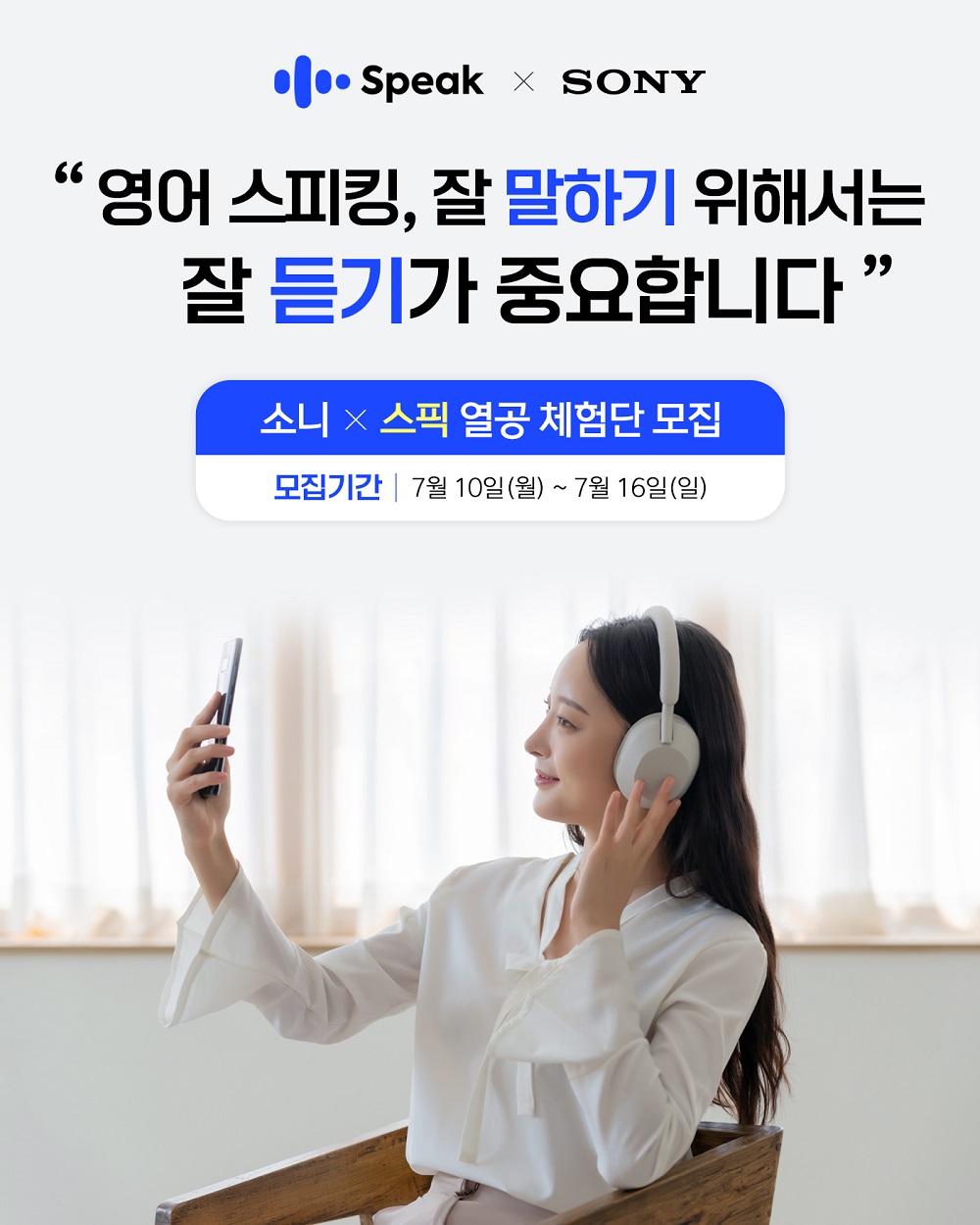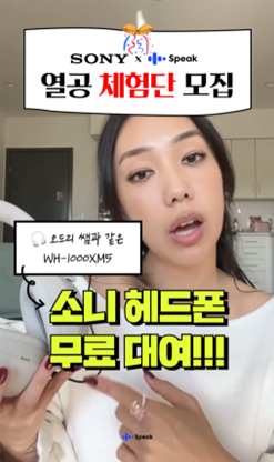 소니와 영어 회화앱 ‘스픽’이 협업해 소니 헤드폰 WH-1000XM5 체험단을 8월 1일부터 4주간 진행합니다. 총 20명의 체험단에게 스픽 이용권과 소니의 인기 헤드폰 WH-1000XM5를 체험할 수 있는 기회를 통해 공부에 몰입할 수 있는 경험을 제공하는데요. 아쉽게 체험단에 선정되지 못했다면, 8월 스픽 앱에서 한 달간 진행되는 불꽃 챌린지에 참여해 보세요. 열심히 스픽 수업을 듣는 것만으로도 소니 헤드폰 등 경품 당첨의 주인공이 될 수 있으니까요!