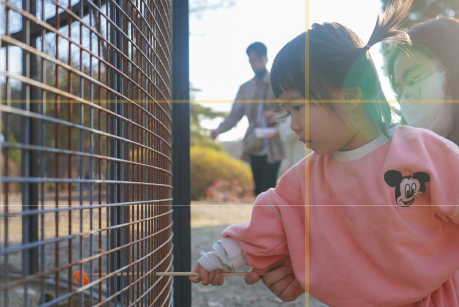 카메라의 3분할선 기능을 활용하면 절대 실패하지 않는 구도로 촬영할 수 있습니다. 우리 아이를 찍을 때 3분할 선 라인에 위치 시킨 뒤 촬영을 합니다. 이때 아이가 바라보는 곳이 화면상 넓게 찍으면 대체로 잘 찍은 듯한 느낌으로 담을 수 있습니다.