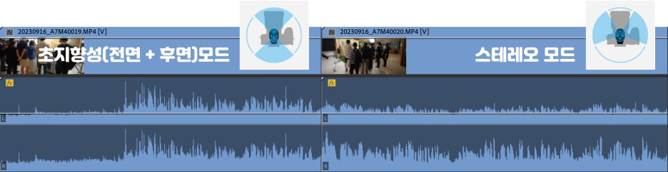 영상은 초지향성 모드 그리고 전후면 모드를 변경한 것과 스테레오 모드를 사용한 테스트 영상인데 제가 카메라로부터 뒤로 약 10cm 정도 뒤에서 작게 말한 사운드 입니다. 들어보시면 아시겠지만 초지향성 모드에서는 뒤에서 이야기하는 제 목소리가 거의 들리지 않을 정도입니다. 위 이미지의 오디오 트랙의 볼륨 크기에서 보듯 그 차이가 명확하며 이 정도의 소음 공간에서도 제 목소리를 또렷하게 담을 수 있다는 것이 참 매력적인 부분입니다. 물론 후면만을 초지향성으로 담는다면 훨씬 더 제 목소리 위주로 담을 수 있을 것입니다.