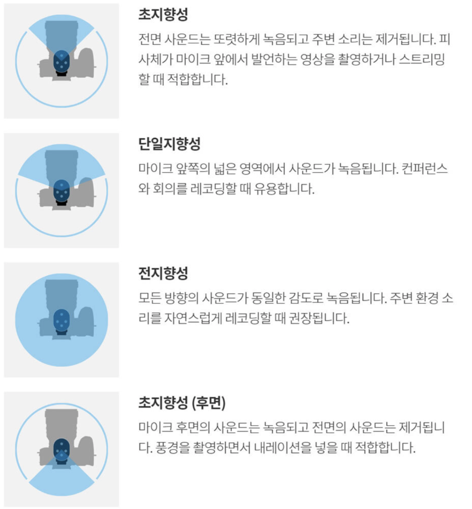 전체 모드에 대한 간략한 설명입니다. 움직임이 적은 실내 촬영 등에서는 여러 가지 마이크를 맞춰 교체 사용하기도 하지만 그나마도 시간적인 여유가 없거나 계속 움직이면서 촬영을 해야 하는 경우, 짐벌 사용의 경우 등에는 마이크 교체는 상당한 수고입니다. 때문에 이렇게 다양한 모드를 쉽게 변경 가능한 타입은 상당히 메리트가 있습니다.