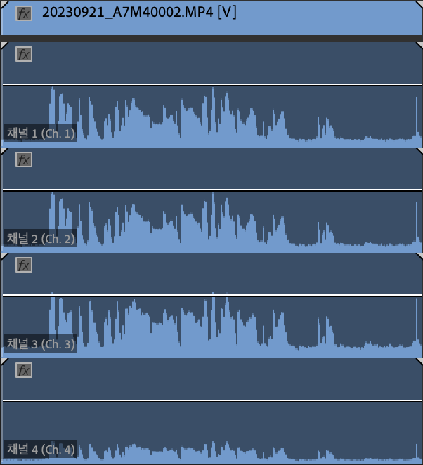 ECM-M1의 경우 물리적으로 4개의 마이크를 갖고 있기 때문에 빔포밍 기술을 사용 가능한데 4개의 마이크를 활용하여 백업레코딩까지 가능한 부분은 앞서 보여드린 다른 마이크와의 기능적 차이입니다. 폼팩터가 다른 신형인만큼 소니 카메라 중 4채널 오디오 입력이 가능한 기종은 이 4개의 마이크 중 3,4채널을 백업용도로 사용하여 1,2 채널은 L.R 스테레오로 3채널은 전지향성 백업 그리고, 4채널은 -20dB가 작게 녹음되어 갑자기 입력값이 큰 소리가 난 경우를 대체할 수 있게 하거나 편집 시 전체를 믹싱할 수 있게 만들어 줍니다. (오른쪽 사진의 4개의 오디오 트랙으로 구분된 모습)