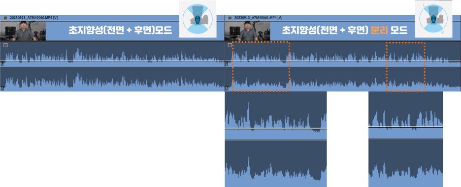 초지향성 전후면 모드에서 분리 모드의 경우 편집툴에서 각각을 분리해서 작업할 수는 있습니다. 이미지 상 확대된 부분을 보면 위아래 두 채널이 서로 다르게 녹음이 된 것을 알 수 있습니다.