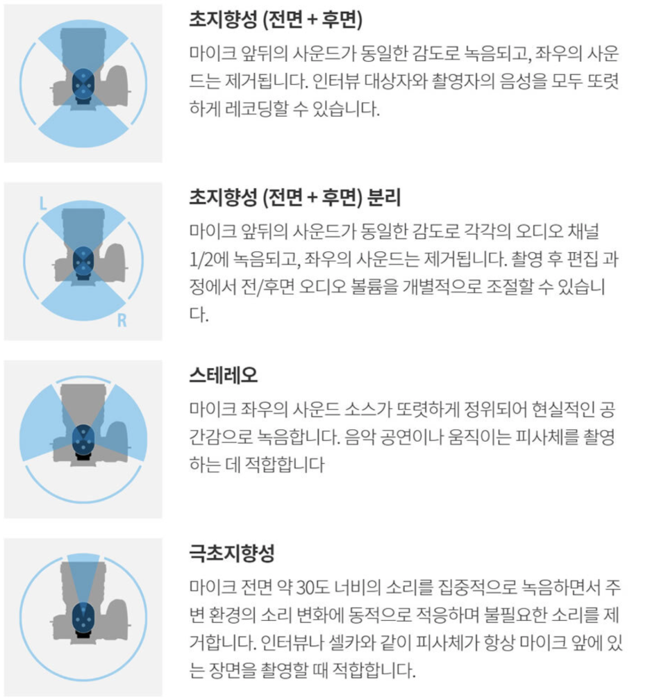 전체 모드에 대한 간략한 설명입니다. 움직임이 적은 실내 촬영 등에서는 여러 가지 마이크를 맞춰 교체 사용하기도 하지만 그나마도 시간적인 여유가 없거나 계속 움직이면서 촬영을 해야 하는 경우, 짐벌 사용의 경우 등에는 마이크 교체는 상당한 수고입니다. 때문에 이렇게 다양한 모드를 쉽게 변경 가능한 타입은 상당히 메리트가 있습니다.