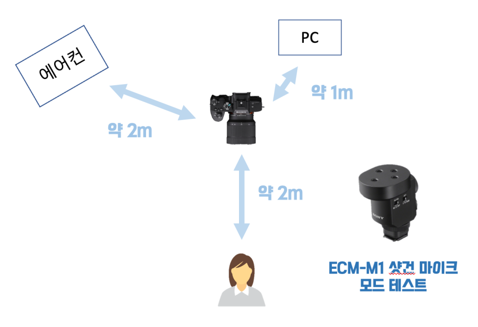 테스트 공간은 13평 정도 되는 공간으로 창문과 벽으로 되어 있는 작업실 공간으로 별도의 흡음 시설은 되어 있지 않아 기본적으로 울리는 구조입니다. 카메라를 놓고 약 2미터 정도 떨어진 상태이며, 이미지와 같이 측후면으로 에어컨이 중간 정도 세기로, 후 측으로 1미터 정도 뒤로는 PC로 음악을 켜놓오 있는 상태입니다.