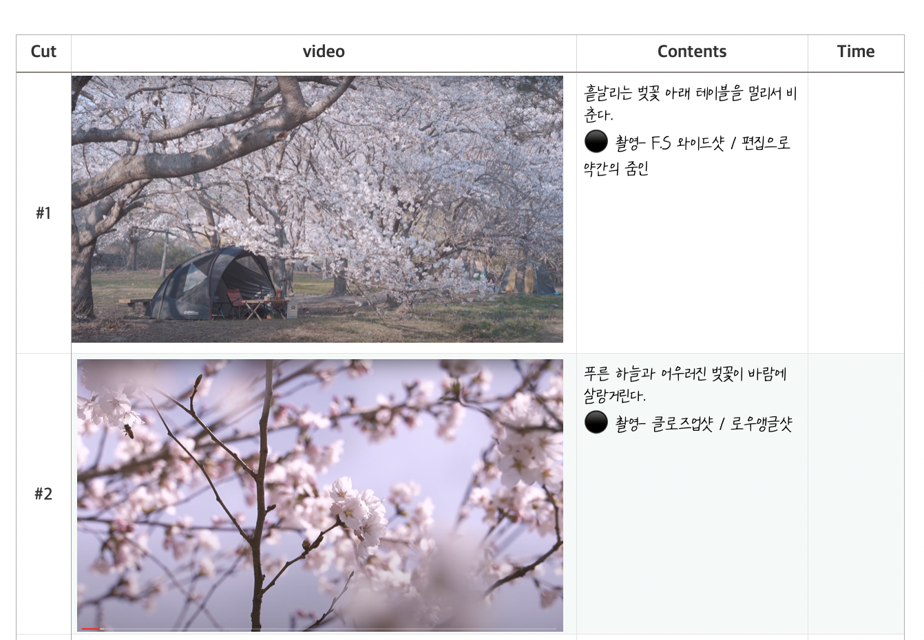이렇게 자연스러운 이야기의 흐름대로 구도와 샷 등을 구상하면 되는 거죠. 물론 여기서 중요한 것은 같은 자리에서 화각만 달라지는 영상은 예쁘지 않기 때문에, 카메라의 위치도 변경하면서 촬영해 샷의 변화를 느껴지게 하는 것이 포인트랍니다.