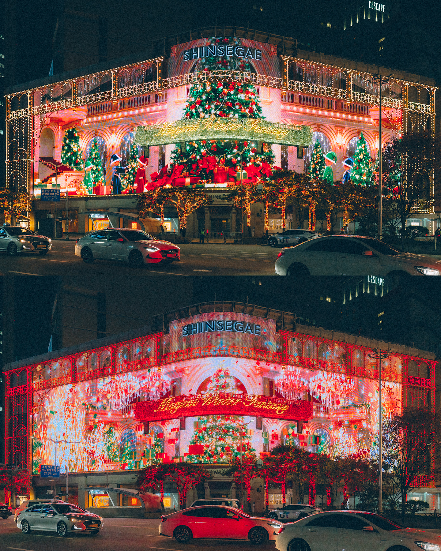 이미 관광지이자 서울 데이트 장소로 유명한 명동 신세계 백화점은 연말이 되면 포토스팟으로 사람이 가득차고는 합니다. 명동 신세계 백화점 본점의 건물 전체를 덮은 화려한 미디어 파사드(Media Façade)는 연말 볼거리 중 하나로, 가로와 세로 길이가 무려 63m, 18m이며 375만 개의 LED 칩으로 국내 최대 사이즈라고 합니다. 광활한 전광판 속 수많은 LED 칩이 현란하게 빛나는 모습은 지나가는 사람들의 발걸음을 붙잡고 쉽게 눈을 떼지 못하게 하죠. 매년 방문을 다짐하고 아직 가보지 못하셨다면, 올해는 미디어 파사드 앞에서 연말을 한 컷 기록해 보시는 것은 어떨까요? 화려하고 아름다운 연말 속 인상깊은 하루를 만들어주는 특별한 배경이 되어줄 거예요.