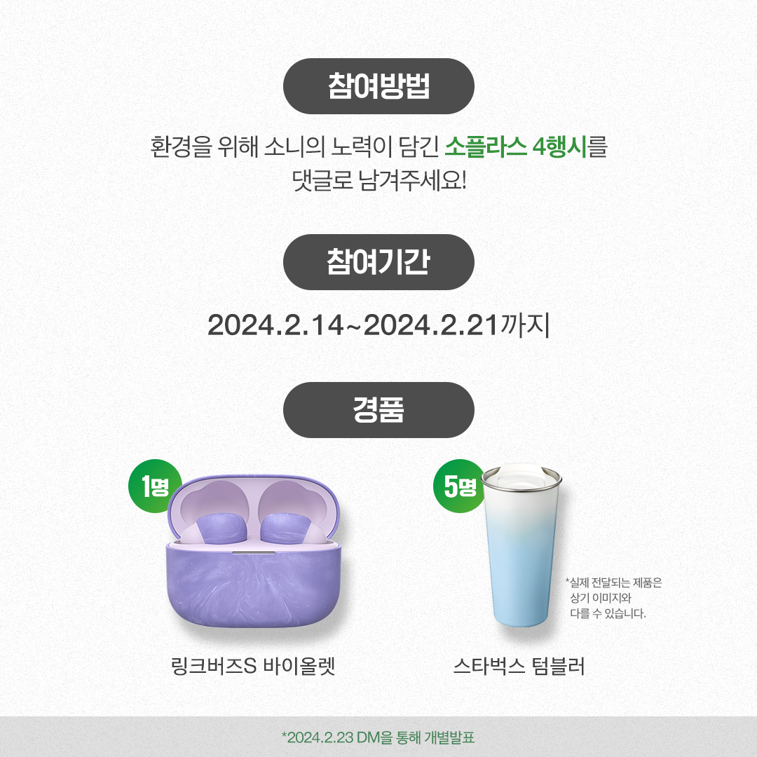 소니코리아에서는 소플라스를 알리고 여러분과 함께 지구 환경 보호에 기여할 수 있는 이벤트를 준비했습니다. 2월 14일부터 21일까지 소니코리아 공식 인스타그램에서 소플라스 사행시 이벤트가 진행됩니다. 카드뉴스를 통해 소플라스 소재에 대해 알아보고 댓글을 통해 이벤트에 참여해주세요. 참여해주신 분들 중 추첨을 통해 링크버즈 S 바이올렛 (1명), 스타벅스 텀블러 (5명)의 다양한 경품을 증정합니다. 댓글로 여러분들의 재밌는 아이디어를 보여주세요!