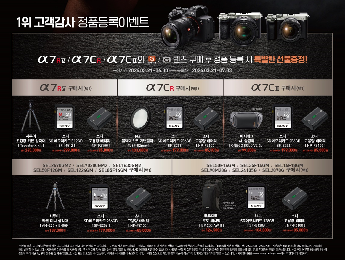 이번 프로모션 이벤트 기간 동안 소니의 알파 풀프레임 미러리스 카메라 3종 (Alpha 7R Ⅴ, Alpha 7C R, Alpha 7C II) 및 GM 렌즈, G 렌즈 12종을 6월 30일(일)까지 구매하고 7월 3일(수)까지 소니코리아 고객지원 사이트(sony.co.kr/electronics/support)에서 정품등록과 사은품 신청을 완료하면 구매 제품에 따라 다양한 선물을 증정한다.