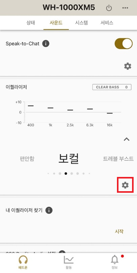 장르와 음악 특성에 맞는 이퀄라이저 편집을 통해 음악 장르에 맞는 음질로 한껏 즐길 수 있죠. 이퀄라이저 프리셋 설정으로 나만의 취향을 담은 세팅을 만들 수 있습니다. [이퀄라이저] 메뉴에서 톱니바퀴 아이콘을 선택하면 음질을 위한 프리셋 편집으로 전환되어 나만의 이퀄라이저 프리셋을 만들어보세요. 나만의 커스텀 이퀄라이저를 설정하기 어렵다면 보컬, 밝음, 부드러움, 베이비부스트 등 기존의 프리셋을 이용해보세요. 밋밋했던 음악도 더욱 생동감있게, 하나의 헤드폰으로 수많은 장르를 즐길 수 있습니다.